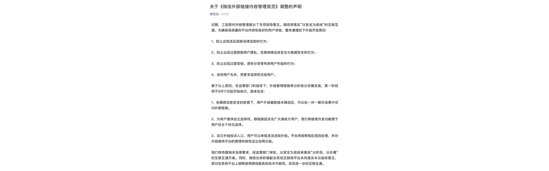 在9月17号解除“屏蔽网址链接”最后期限的当天,微信官方推送了《微信外部链接内容管理规范》调整的声明:
